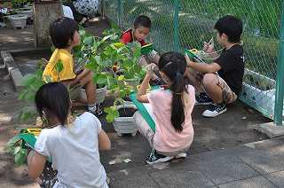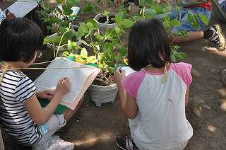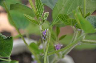 花が咲いた大豆を観察しています。