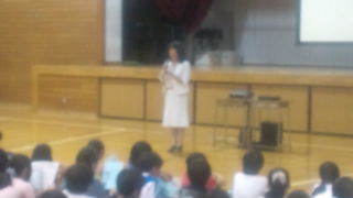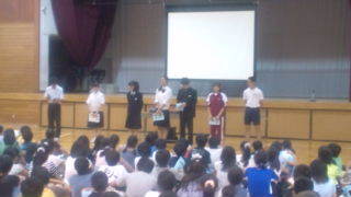 四中にいます。四中の紹介ビデオが終わり、校長先生のお話や、生徒会の役員の説明を真剣に聞いています。14時30分
