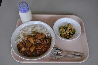 今日は芳ばしく揚げた大豆とじゃこをのせた歯ごたえのあるサラダです。よくかんで食べましょう。