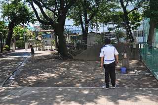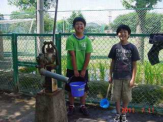 Megaプログラムの一環として、栽培委員会の子どもたちが、井戸水を使ったうち水をしています。
