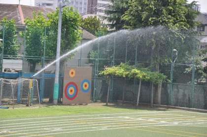 気温が上がってきたので、人工芝に散水しています。天然芝にも水をまきました。