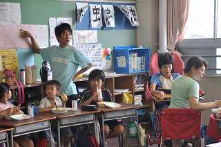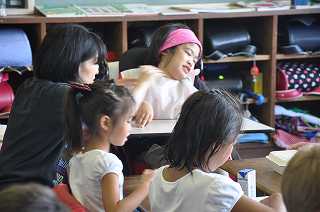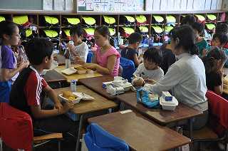 わかたけ学級の子どもたちが、縦割り班の教室に行き、お弁当給食を食べています。