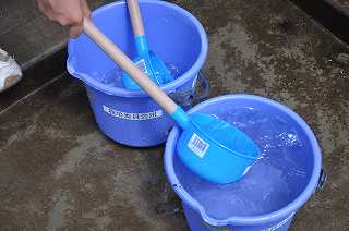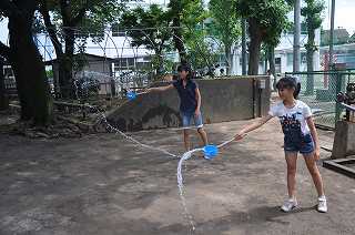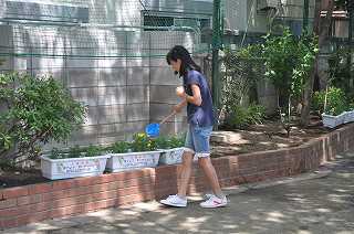 栽培委員会の子どもたちが、井戸水を使って水うちをしています。その後で、自分たちが世話をしている人権の花にも水をあげています。