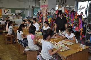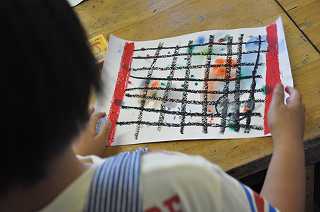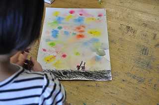 子どもたちが作ったぼかしを入れた台紙に、休み時間の様子を書き入れています。