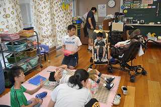 休み時間を使って、わかたけ学級の1組と2組の子どもが交流をしています。