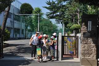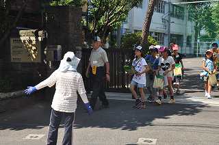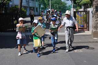 今日は4年1組の子どもたちが6つの地域に分かれ、地域の方と一緒に安全マップを作ります。9時10分に学校を出発し、フィールドワークに出かけました。