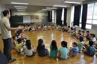 みんなで丸くなり、ボールを使ったゲームをしています。