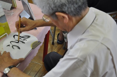 東京都小学校書写研究会主催の書写の研修会が行われています。作品の押す自分の落款を消しゴムで作り、うちわに字を書きました。
