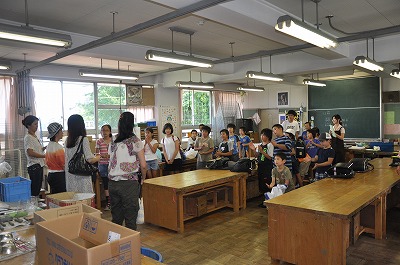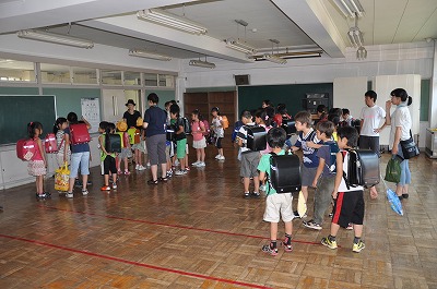 大型台風の接近という想定で地域班による集団下校をしています。まず、全校児童が決められた各教室にい移動しました。そこで人数確認をして下校です。保護者の皆様もご協力くださいました。