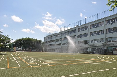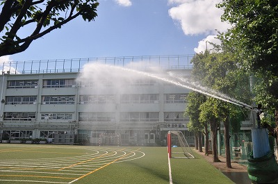 暑い1日です。クラブ活動をする前に、校庭に水をまいています。