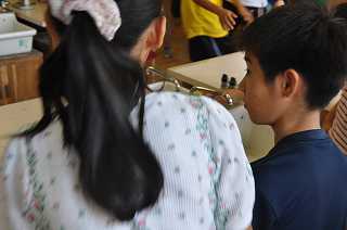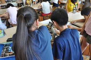 ツユクサの葉を顕微鏡で観察しています。大きい目玉のようなものが見えるようです。