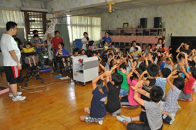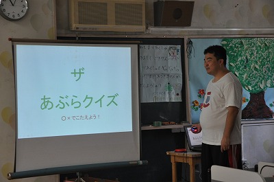 わかたけクイズに答えています。正解は、わかたけの子どもたちが○×で発表します。