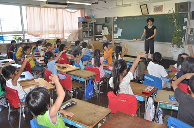 鉢で育てたトマトは、畑で育てたトマトと比べてなぜ大きくならないのかをみんなで考えています。