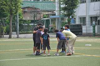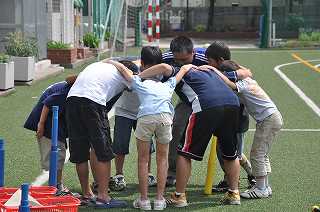 練習を終えて、ゲームを行います。ゲームの前にチームで円陣を組みました。