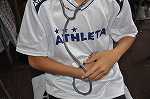 聴診器を使って、体の中の音を聞いています。