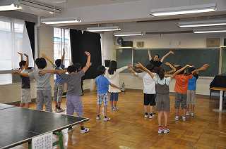 英語で遊ぼうが始まりました。まず、音楽に合わせて体を動かしています。
