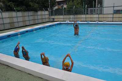 夏の太陽が照りつけるプールで練習しています。