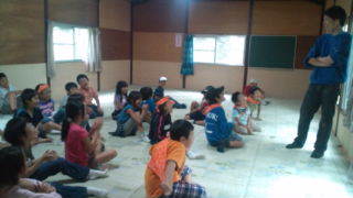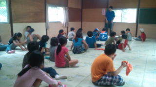 清東園キャンプ場にいます。雨のためにハイキングが中止になりました。荷物整理と部屋の掃除が終わった子どもたちが大きな部屋に集まって来ました。9:35