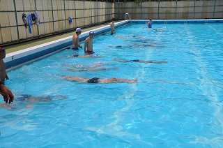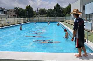 けのび、バタ足など基本の動きを確認しています。