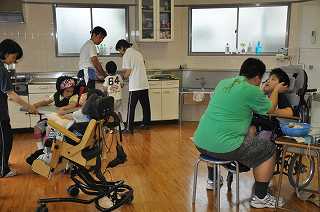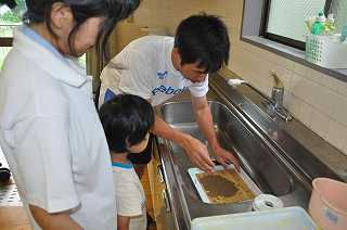 油面プールが中止になったので、段ボールを細かく破って水に溶く紙作りをしました。