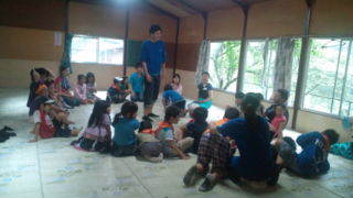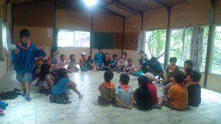 清東園キャンプ場にいます。大きな部屋でリーダーによるゲームが行われています。10:05