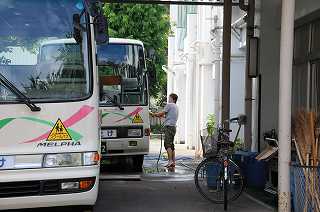 わかたけ学級の子どもたちが気持ちよく登校できるように、バスの清掃と点検を行っています。