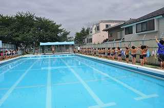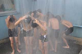 準備運動をし、熱中症予防のための水を飲み、シャワーを浴びています。