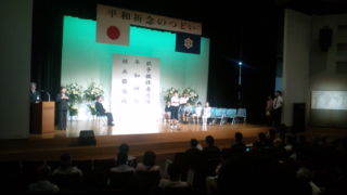 目黒区の平和祈念のつどいの中で、平成23年度平和祈念標語優秀賞の表彰が行われています。油面小学校の代表として選ばれた6年生がその標語を発表しています。堂々と発表でき立派です。
