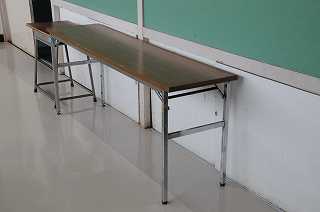各教室の廊下に長机が置かれています。この机で、子どもたちの作品を展示します。