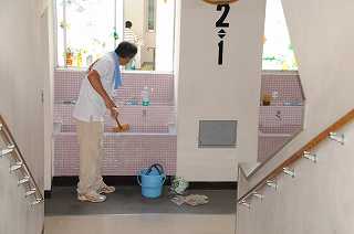 手洗い場の清掃をおこなっています。