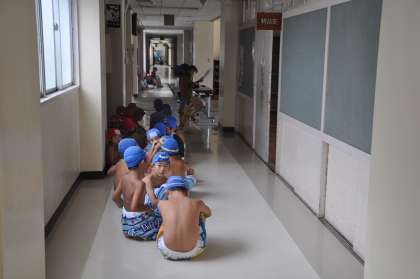 低学年の子どもたちがプールに来ています。受付を済ませ、着替えをし、並んでいます。