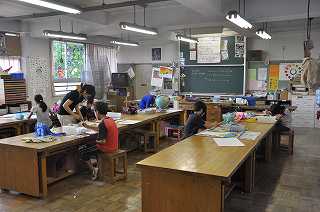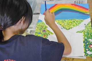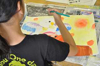 サマースクールで描いていたポスターを仕上げに、子どもたちが集まっています。