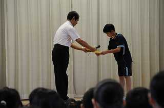 平和を祈る標語をつくり、8月6日に優秀賞として表彰された6年生とその作品を、全校児童に紹介しました
