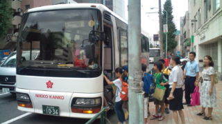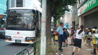 今日は4年生が社会科見学に行きます。目黒通りでバスに乗り出発しました。8:05