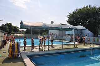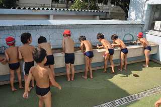 子どもたちがプールに集まりました。まず、準備運動をして、水を飲み、シャワーを浴びています。