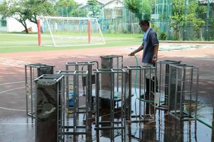 久しぶりに顔を出した太陽の下で、傘立ての清掃を行っています。