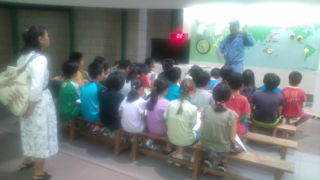 4年生が中央防波堤の管理事務所にいます。ゴミの話を聞いています。9:10