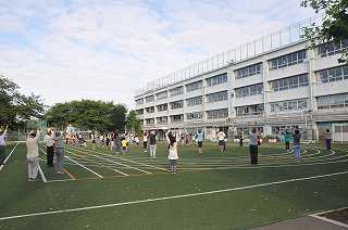 6時30分からラジオ体操が始まりました。たくさんの子どもたち、保護者、地域の皆さんが参加しています。