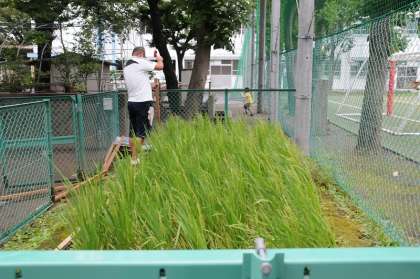 大きくなり、穂が付いてきたので、これから網をかけて鳥から守ります。