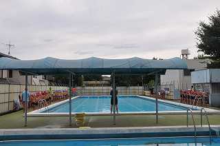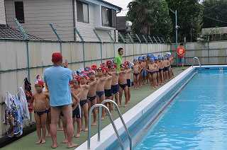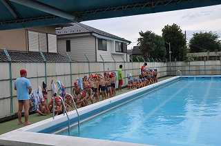プールサイドに全員そろいました。整列をし、バディーで人数確認をしています。