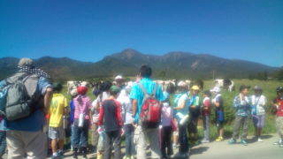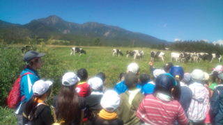 八ヶ岳ふれあいファームにいます。八ヶ岳をバックに牛を見ながら牧場の説明を聞いています。10:20