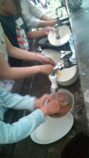 清東園キャンプ場にいます。みんなで夕飯の後片付けをしています。自然を汚さないために皿のカレーを紙で拭き取ってから水洗いしています。17:55