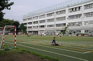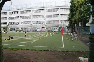 雨が止んだ中休みに、子どもたちは元気に外遊びをしています。