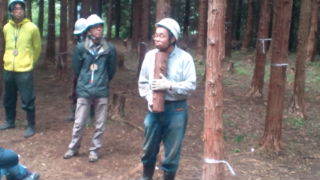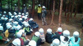 みずがきランドにいます。ブリナワを使った木登り体験が終わりました。次は間伐体験です。まずお話を聞いています。10:25