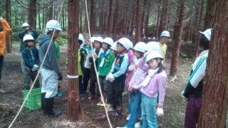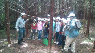 みずがきランドにいます。間伐体験が始まります。グループに分かれて説明を聞いています。10:30