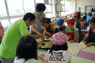 各班ごとに餃子の皮を使い、自分たちが育てたトマトとピーマンなどを具にして餃子ピーマンを焼きます。