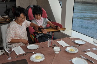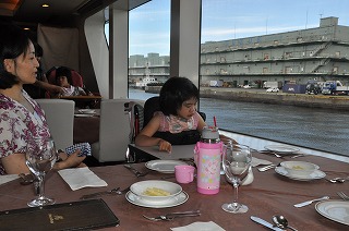 マリーンルージュ号のレストランの席に着きました。出発時刻になり、船は港を出発しました。12:05