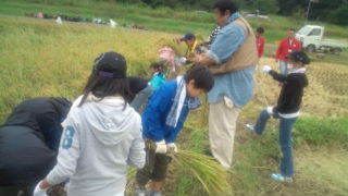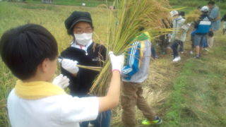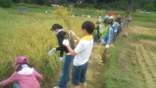 5年生が東松山の田んぼにいます。稲刈りが始まりました。11:25