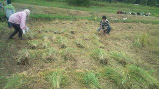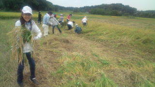 5年生が東松山の田んぼにいます。稲刈りが進んでいます。11:35