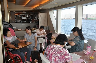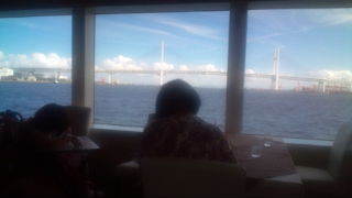 船にいます。デッキが暑いのでレストランに戻りました。13:50
